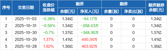 融资方面,当日融资买入642.19万元,融资偿还706.37万元,融资净偿还64.17万元,连续3日净偿还累计680.96万元。融券方面,融券卖出0股,融券偿还0股,融券余量0股,融券余额0元。融资融券余额合计1.34亿元。