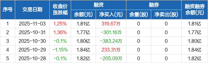 融资方面,当日融资买入766.95万元,融资偿还447.28万元,融资净买入319.67万元。融券方面,融券卖出0股,融券偿还0股,融券余量0股,融券余额0元。融资融券余额合计1.81亿元。
