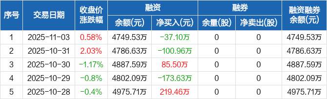 融资方面,当日融资买入220.29万元,融资偿还257.39万元,融资净偿还37.1万元。融券方面,融券卖出0股,融券偿还0股,融券余量0股,融券余额0元。融资融券余额合计4749.53万元。