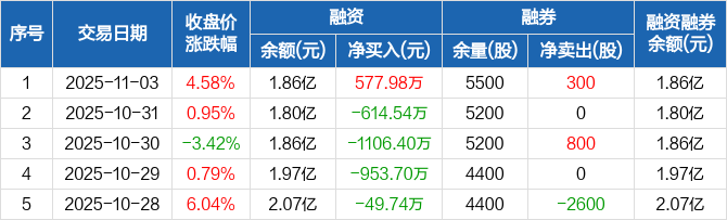 融资方面,当日融资买入2903.19万元,融资偿还2325.22万元,融资净买入577.98万元。融券方面,融券卖出300股,融券偿还0股,融券余量5500股,融券余额4.27万元。融资融券余额合计1.86亿元。