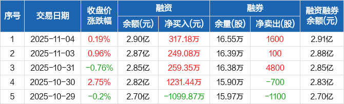 融资方面,当日融资买入1202.2万元,融资偿还885.02万元,融资净买入317.18万元,连续4日净买入累计2057.06万元。融券方面,融券卖出1600股,融券偿还0股,融券余量16.55万股,融券余额86.89万元。融资融券余额合计2.91亿元。