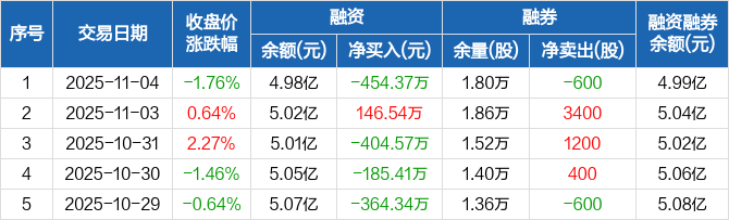 融资方面,当日融资买入1189.83万元,融资偿还1644.19万元,融资净偿还454.37万元。融券方面,融券卖出0股,融券偿还600股,融券余量1.8万股,融券余额139.49万元。融资融券余额合计4.99亿元。