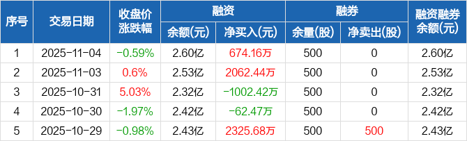 融资方面,当日融资买入2812.92万元,融资偿还2138.76万元,融资净买入674.16万元。融券方面,融券卖出0股,融券偿还0股,融券余量500股,融券余额4180元。融资融券余额合计2.6亿元。