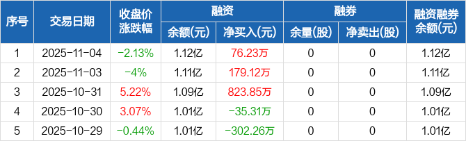 融资方面,当日融资买入1234.14万元,融资偿还1157.92万元,融资净买入76.23万元,连续3日净买入累计1079.2万元。融券方面,融券卖出0股,融券偿还0股,融券余量0股,融券余额0元。融资融券余额合计1.12亿元。