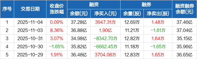 香农芯创融资融券信息显示,2025年11月4日融资净买入3947.31万元;融资余额37.28亿元,创历史新高,较前一日增加1.07%。