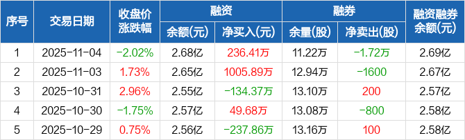 融资方面,当日融资买入486.46万元,融资偿还250.05万元,融资净买入236.41万元。融券方面,融券卖出0股,融券偿还1.72万股,融券余量11.22万股,融券余额136.01万元。融资融券余额合计2.69亿元。