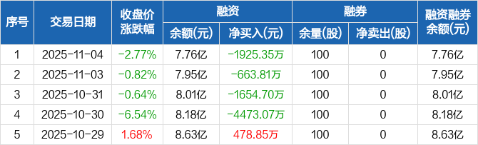 融资方面,当日融资买入9676.3万元,融资偿还1.16亿元,融资净偿还1925.35万元,连续4日净偿还累计8716.94万元。融券方面,融券卖出0股,融券偿还0股,融券余量100股,融券余额2108元。融资融券余额合计7.76亿元。