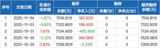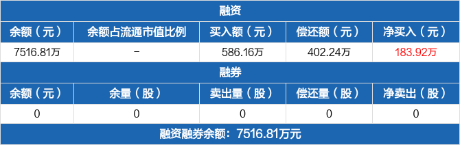 融资方面,当日融资买入586.16万元,融资偿还402.24万元,融资净买入183.92万元。融券方面,融券卖出0份,融券偿还0份,融券余量0份,融券余额0元。融资融券余额合计7516.81万元。