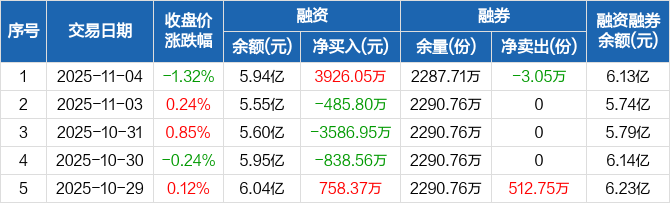 融资方面,当日融资买入8721.11万元,融资偿还4795.06万元,融资净买入3926.05万元。融券方面,融券卖出0份,融券偿还3.05万份,融券余量2287.71万份,融券余额1880.5万元。融资融券余额合计6.13亿元。