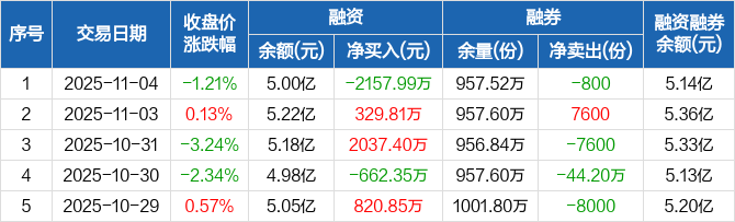 融资方面,当日融资买入8539.09万元,融资偿还1.07亿元,融资净偿还2157.99万元。融券方面,融券卖出0份,融券偿还800份,融券余量957.52万份,融券余额1412.34万元。融资融券余额合计5.14亿元。