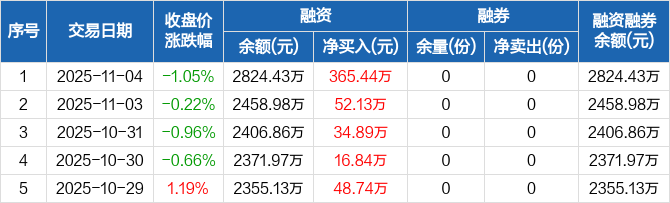 融资方面,当日融资买入634.17万元,融资偿还268.73万元,融资净买入365.44万元,连续5日净买入累计518.03万元。融券方面,融券卖出0份,融券偿还0份,融券余量0份,融券余额0元。融资融券余额合计2824.43万元。