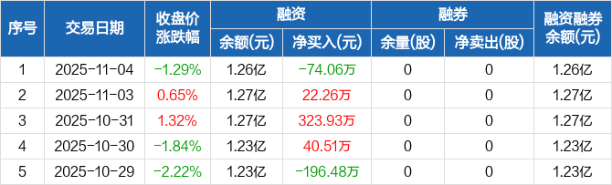 融资方面,当日融资买入464.15万元,融资偿还538.21万元,融资净偿还74.06万元。融券方面,融券卖出0股,融券偿还0股,融券余量0股,融券余额0元。融资融券余额合计1.26亿元。