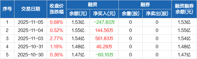 融资方面,当日融资买入310.15万元,融资偿还557.98万元,融资净偿还247.83万元。融券方面,融券卖出0股,融券偿还0股,融券余量0股,融券余额0元。融资融券余额合计1.53亿元。