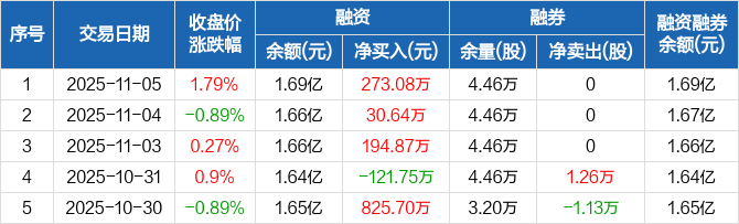 融资方面,当日融资买入1769.58万元,融资偿还1496.5万元,融资净买入273.08万元,连续3日净买入累计498.59万元。融券方面,融券卖出0股,融券偿还0股,融券余量4.46万股,融券余额50.71万元。融资融券余额合计1.69亿元。