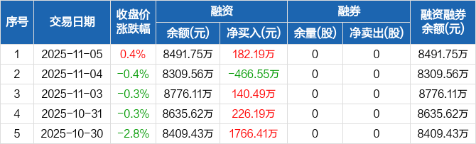 融资方面,当日融资买入812.29万元,融资偿还630.1万元,融资净买入182.19万元。融券方面,融券卖出0股,融券偿还0股,融券余量0股,融券余额0元。融资融券余额合计8491.75万元。