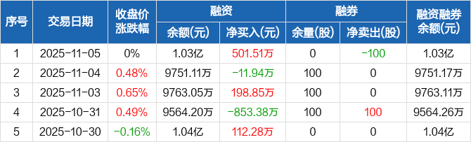 融资方面,当日融资买入931.82万元,融资偿还430.31万元,融资净买入501.51万元。融券方面,融券卖出0股,融券偿还100股,融券余量0股,融券余额0元。融资融券余额合计1.03亿元。