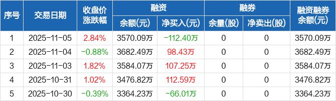 融资方面,当日融资买入533.86万元,融资偿还646.27万元,融资净偿还112.4万元。融券方面,融券卖出0股,融券偿还0股,融券余量0股,融券余额0元。融资融券余额合计3570.09万元。