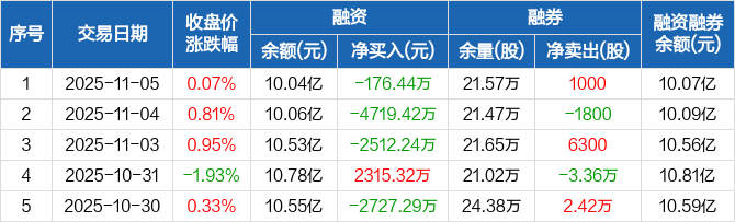 融资方面,当日融资买入2945.37万元,融资偿还3121.8万元,融资净偿还176.44万元,连续3日净偿还累计7408.1万元。融券方面,融券卖出5600股,融券偿还4600股,融券余量21.57万股,融券余额323.33万元。融资融券余额合计10.07亿元。