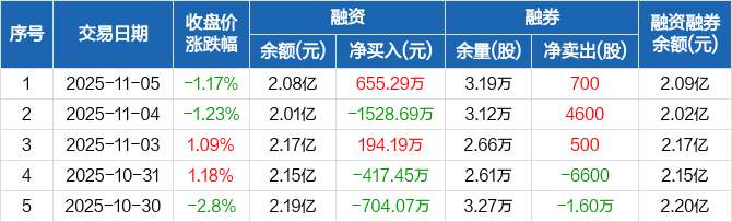 融资方面,当日融资买入1620.31万元,融资偿还965.02万元,融资净买入655.29万元。融券方面,融券卖出800股,融券偿还100股,融券余量3.19万股,融券余额86.26万元。融资融券余额合计2.09亿元。