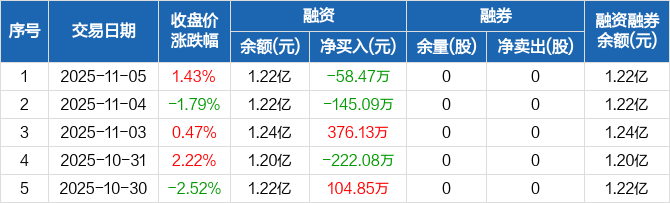融资方面,当日融资买入495.81万元,融资偿还554.28万元,融资净偿还58.47万元。融券方面,融券卖出0股,融券偿还0股,融券余量0股,融券余额0元。融资融券余额合计1.22亿元。