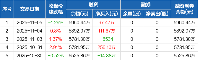 融资方面,当日融资买入303.31万元,融资偿还235.85万元,融资净买入67.47万元。融券方面,融券卖出0股,融券偿还0股,融券余量0股,融券余额0元。融资融券余额合计5960.44万元。