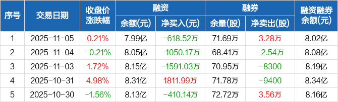 融资方面,当日融资买入4136.11万元,融资偿还4754.63万元,融资净偿还618.52万元,连续3日净偿还累计3259.72万元。融券方面,融券卖出3.71万股,融券偿还4300股,融券余量71.69万股,融券余额338.38万元。融资融券余额合计8.02亿元。