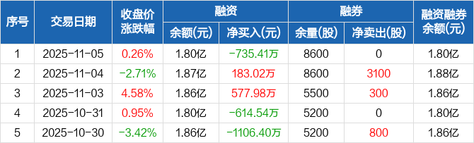 融资方面,当日融资买入1018.61万元,融资偿还1754.01万元,融资净偿还735.41万元。融券方面,融券卖出0股,融券偿还0股,融券余量8600股,融券余额6.51万元。融资融券余额合计1.8亿元。