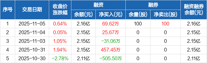 融资方面,当日融资买入1220.48万元,融资偿还1150.86万元,融资净买入69.62万元。融券方面,融券卖出100股,融券偿还0股,融券余量100股,融券余额2035元。融资融券余额合计2.16亿元。