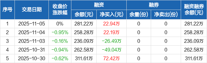 融资方面,当日融资买入86.73万元,融资偿还63.79万元,融资净买入22.94万元。融券方面,融券卖出0份,融券偿还0份,融券余量0份,融券余额0元。融资融券余额合计281.22万元。