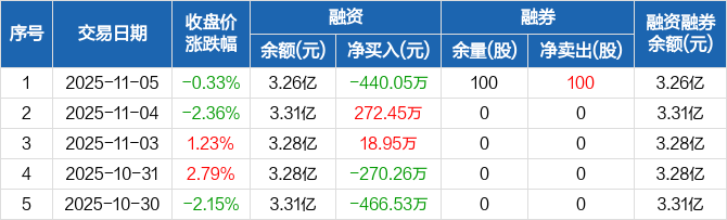 融资方面,当日融资买入1032.13万元,融资偿还1472.18万元,融资净偿还440.05万元。融券方面,融券卖出100股,融券偿还0股,融券余量100股,融券余额1523元。融资融券余额合计3.26亿元。
