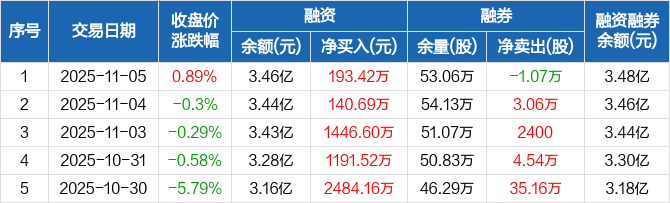 融资方面,当日融资买入1093.45万元,融资偿还900.02万元,融资净买入193.42万元,连续5日净买入累计5456.39万元。融券方面,融券卖出7300股,融券偿还1.8万股,融券余量53.06万股,融券余额180.93万元。融资融券余额合计3.48亿元。