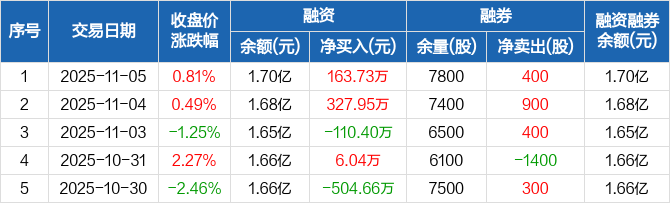 融资方面,当日融资买入1526.83万元,融资偿还1363.09万元,融资净买入163.73万元。融券方面,融券卖出400股,融券偿还0股,融券余量7800股,融券余额19.34万元。融资融券余额合计1.7亿元。