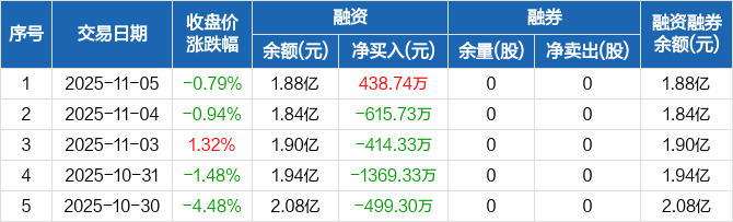 融资方面,当日融资买入1658.38万元,融资偿还1219.64万元,融资净买入438.74万元。融券方面,融券卖出0股,融券偿还0股,融券余量0股,融券余额0元。融资融券余额合计1.88亿元。
