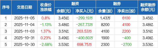 融资方面,当日融资买入732.92万元,融资偿还1032.11万元,融资净偿还299.19万元。融券方面,融券卖出6400股,融券偿还300股,融券余量1.43万股,融券余额12.61万元。融资融券余额合计3.45亿元。