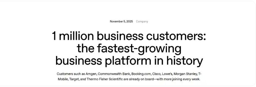 OpenAI称,随着ChatGPT每周活跃用户超过8亿人,消费市场的广泛接受也推动企业采纳AI——企业试用周期正变得越来越短、部署阻力越来越小。