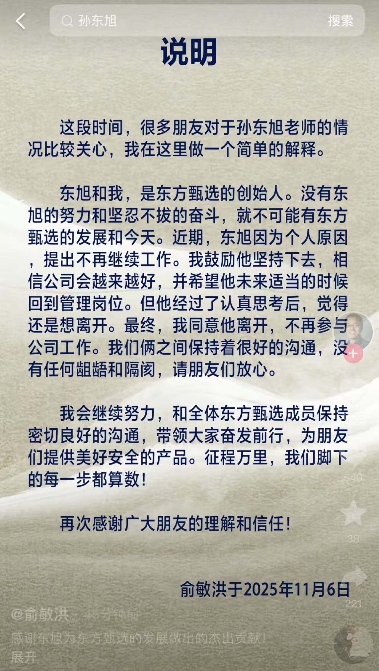11月6日,俞敏洪在其抖音号发布声明称:“这段时间,很多朋友对于孙东旭老师的情况比较关心,我在这里做一个简单的解释。东旭和我,是东方甄选的创始人。没有东旭的努力和坚忍不拔的奋斗,就不可能有东方甄选的发展和今天。近期,东旭因为个人原因,提出不再继续工作。我鼓励他坚持下去,相信公司会越来越好,并希望他未来适当的时候回到管理岗位。但他经过了认真思考后,觉得还是想离开。最终,我同意他离开,不再参与公司工作。我们俩之间保持着很好的沟通,没有任何龃龉和隔阂,请朋友们放心。我会继续努力,和全体东方甄选成员保持密切良好的沟通,带领大家奋发前行,为朋友们提供美好安全的产品。”