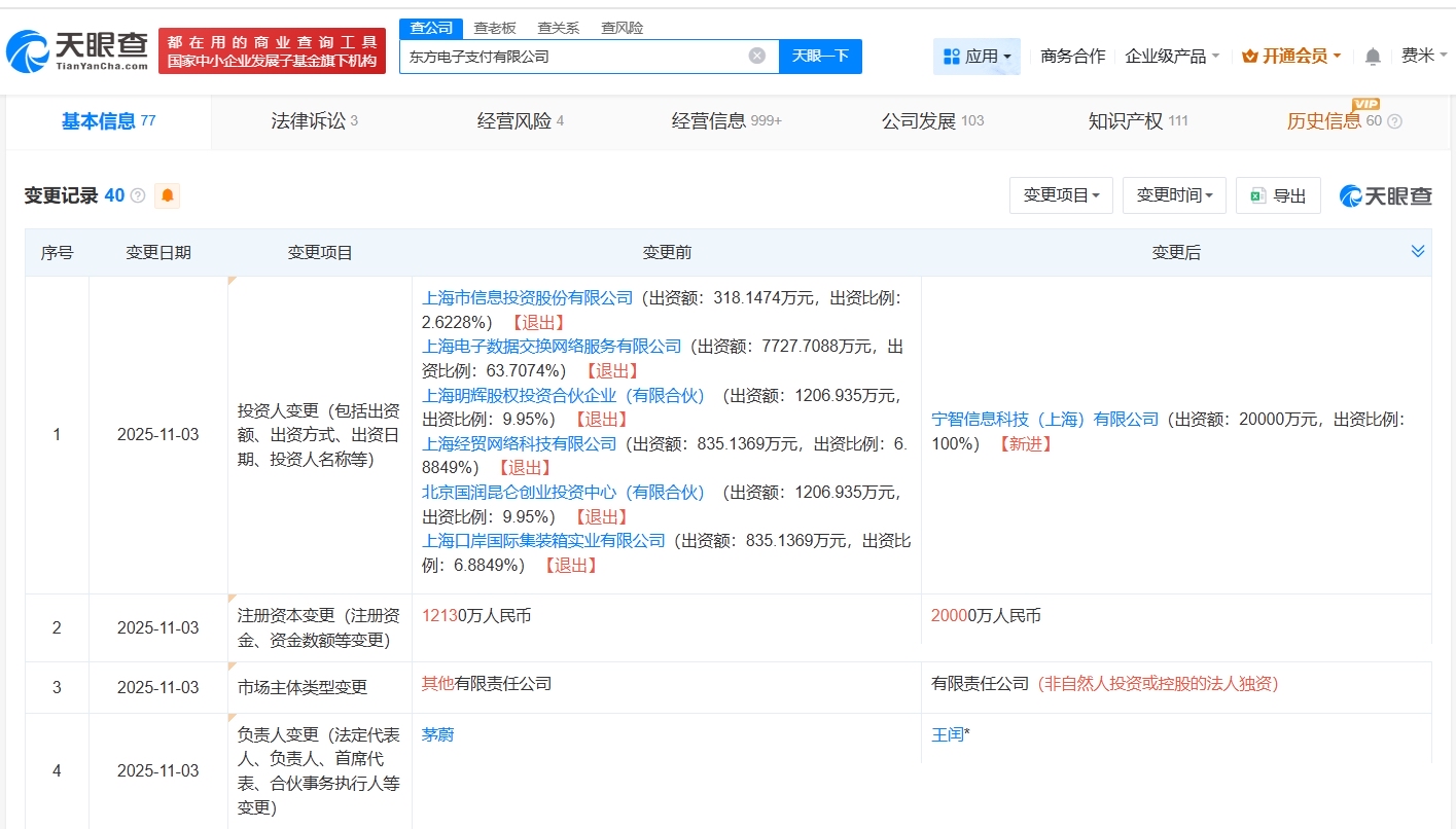 11月6日,天眼查工商信息显示,东方电子支付有限公司(以下简称“东方支付”)完成重大股权变更,原6家股东全部退出,宁智信息科技(上海)有限公司成为其唯一控股股东。