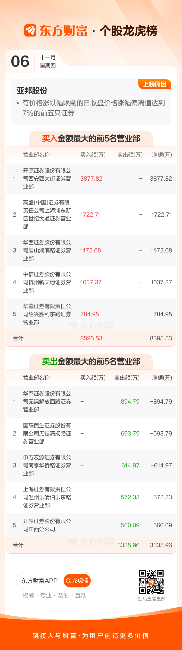交易所2025年11月6日公布的交易公开信息显示,亚邦股份因成为有价格涨跌幅限制的日收盘价格涨幅偏离值达到7%的前五只证券上榜。亚邦股份当日收报5.35元,涨跌幅10.08%,偏离值9.11%,换手率12.25%,成交额3.65亿。