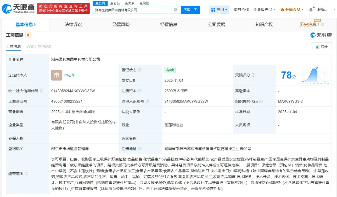 南方财经11月6日电,天眼查App显示,近日,湖南医药集团中药材有限公司成立,法定代表人为申志华,注册资本2500万人民币,经营范围包括药品批发、中药饮片代煎服务、农产品质量安全检测等。股东信息显示,该公司由湖南医药集团有限公司全资持股。