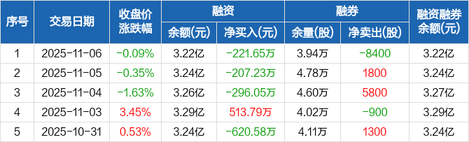 融资方面,当日融资买入427.59万元,融资偿还649.24万元,融资净偿还221.65万元,连续3日净偿还累计724.93万元。融券方面,融券卖出200股,融券偿还8600股,融券余量3.94万股,融券余额45.11万元。融资融券余额合计3.22亿元。