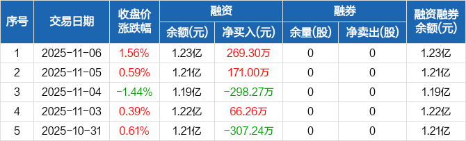 融资方面,当日融资买入1026.89万元,融资偿还757.59万元,融资净买入269.3万元。融券方面,融券卖出0股,融券偿还0股,融券余量0股,融券余额0元。融资融券余额合计1.23亿元。