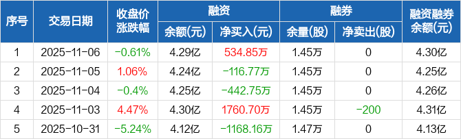 融资方面,当日融资买入3199.97万元,融资偿还2665.12万元,融资净买入534.85万元。融券方面,融券卖出0股,融券偿还0股,融券余量1.45万股,融券余额119.37万元。融资融券余额合计4.3亿元。