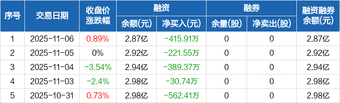 融资方面,当日融资买入626.44万元,融资偿还1042.35万元,融资净偿还415.91万元,连续7日净偿还累计2804.94万元。融券方面,融券卖出0股,融券偿还0股,融券余量0股,融券余额0元。融资融券余额合计2.87亿元。