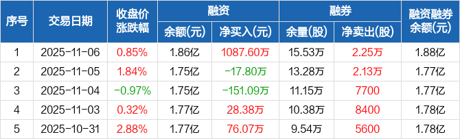融资方面,当日融资买入2178.87万元,融资偿还1091.27万元,融资净买入1087.6万元。融券方面,融券卖出2.69万股,融券偿还4400股,融券余量15.53万股,融券余额147.22万元。融资融券余额合计1.88亿元。