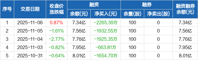 融资方面,当日融资买入6328.06万元,融资偿还8593.45万元,融资净偿还2265.39万元,连续6日净偿还累计1.29亿元。融券方面,融券卖出0股,融券偿还0股,融券余量100股,融券余额2092元。融资融券余额合计7.34亿元。