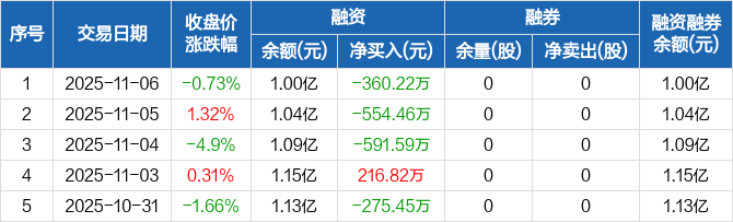 融资方面,当日融资买入643.25万元,融资偿还1003.47万元,融资净偿还360.22万元,连续3日净偿还累计1506.26万元。融券方面,融券卖出0股,融券偿还0股,融券余量0股,融券余额0元。融资融券余额合计1亿元。
