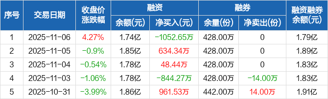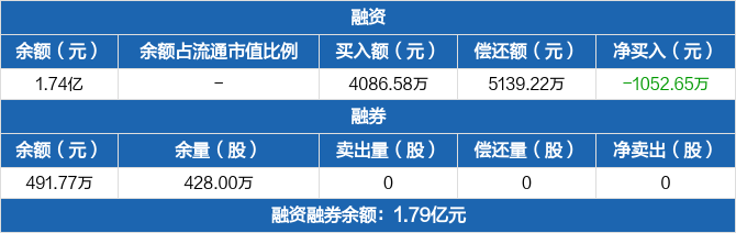 融资方面,当日融资买入4086.58万元,融资偿还5139.22万元,融资净偿还1052.65万元。融券方面,融券卖出0份,融券偿还0份,融券余量428万份,融券余额491.77万元。融资融券余额合计1.79亿元。