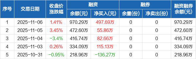 融资方面,当日融资买入722.65万元,融资偿还224.96万元,融资净买入497.69万元,连续4日净买入累计751.33万元。融券方面,融券卖出0份,融券偿还0份,融券余量0份,融券余额0元。融资融券余额合计970.29万元。