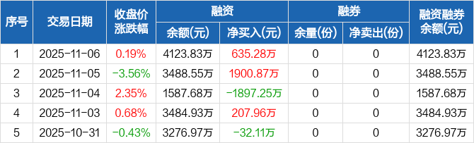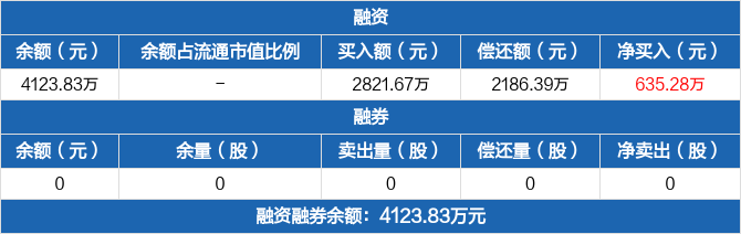 融资方面,当日融资买入2821.67万元,融资偿还2186.39万元,融资净买入635.28万元。融券方面,融券卖出0份,融券偿还0份,融券余量0份,融券余额0元。融资融券余额合计4123.83万元。