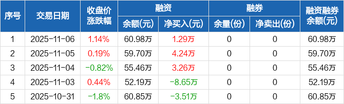 融资方面,当日融资买入4.2万元,融资偿还2.91万元,融资净买入1.29万元,连续3日净买入累计8.79万元。融券方面,融券卖出0份,融券偿还0份,融券余量0份,融券余额0元。融资融券余额合计60.98万元。